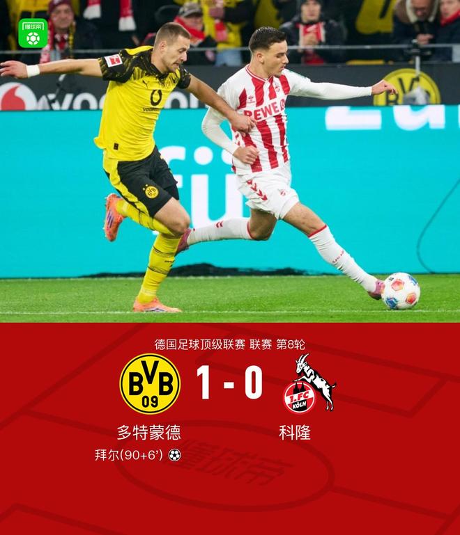 北京时间10月26日,2024-2025赛季德国足球甲级联赛第8轮,多特蒙德坐镇主场迎战科隆。上半场安东禁区推射,皮球高出球门,赛义德-马拉单刀机会,推射打门稍稍偏出,费利克斯-恩梅加弧顶兜射,皮球偏出球门。下半场吉拉西门前劲射,皮球被门将封堵。比赛补时阶段,拜尔禁区后点低射破门完成绝杀。最终凭借此球,多特蒙德以1-0战胜科隆。