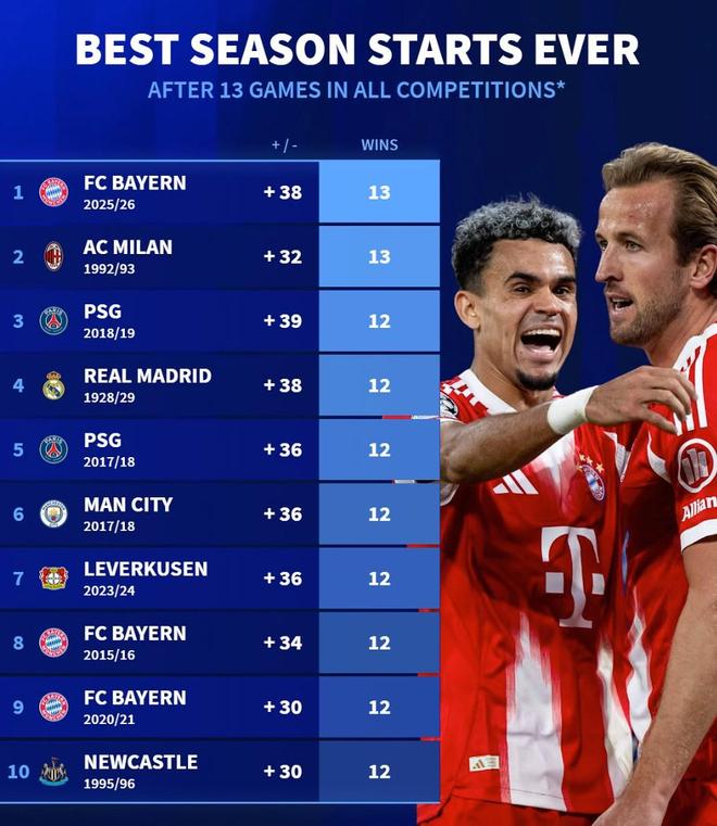 1. 拜仁慕尼黑(2025-26赛季) 13胜 净胜38球